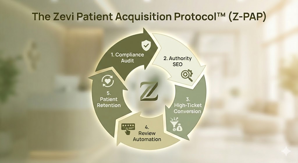 At Zevi Digital, we do not offer “a la carte” services. We offer a system. We call it The Zevi Patient Acquisition Protocol™ (Z-PAP). This is our proprietary, 5-step circular ecosystem designed to dominate local markets.